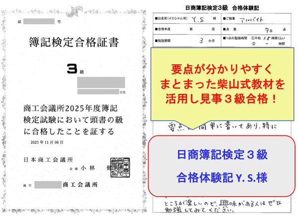 学生が参考書とは違う丁寧な柴山式解説で見事3級合格!日商簿記検定3級 合格体験記(S.E.様)